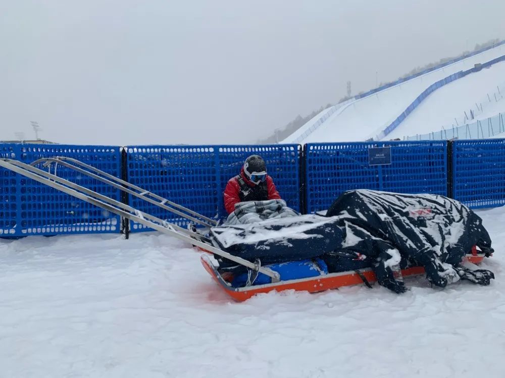 云顶滑雪公园的比赛因为天气推迟,医疗救护人员仍在现场守护。