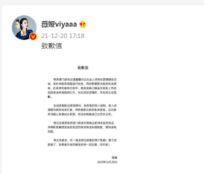 2021年12月20日,薇娅在其微博致歉,称“我愿意为我的错误承担一切后果”。