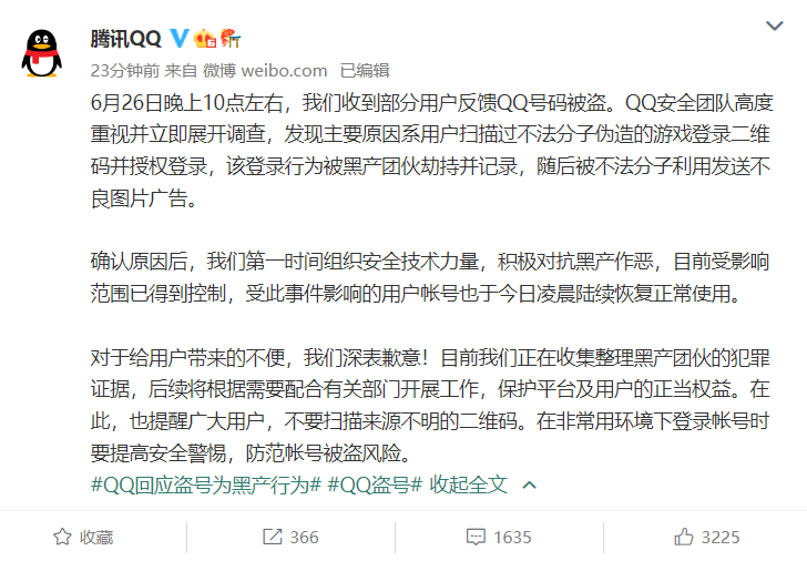 6月27日,腾讯QQ官方微博回应“大量账号被盗”事件:6月26日晚上10点左右,我们收到部分用户反馈QQ号码被盗。QQ安全团队高度重视并立即展开调查,发现主要原因系用户扫描过不法分子伪造的游戏登录二维码并授权登录,该登录行为被黑产团伙劫持并记录,随后被不法分子利用发送不良图片广告。