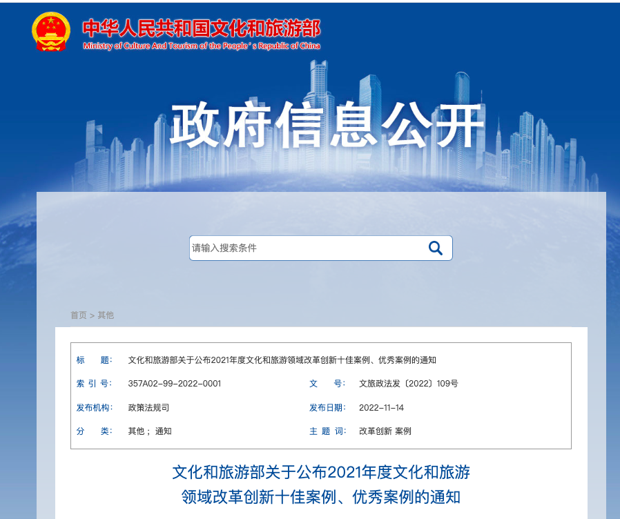 11月16日,文化和旅游部公布2021年度文化和旅游领域改革创新十佳案例、优秀案例,湖北一案例入选优秀案例。
