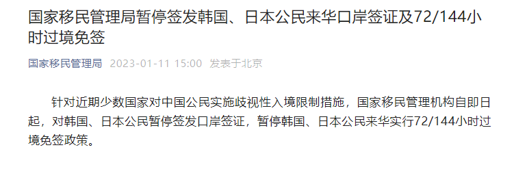 据国家移民管理局1月11日消息:针对近期少数国家对中国公民实施歧视性入境限制措施,国家移民管理机构自即日起,对韩国、日本公民暂停签发口岸签证,暂停韩国、日本公民来华实行72/144小时过境免签政策。