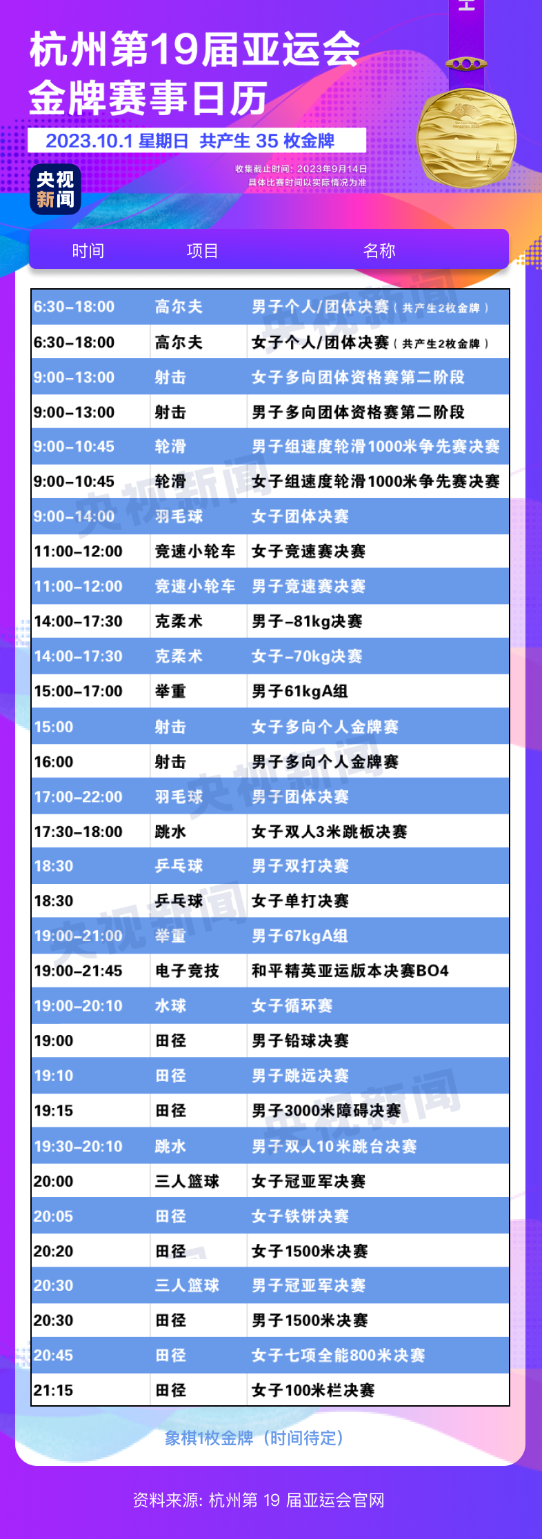 10月1日,杭州亚运会有哪些精彩赛事?观赛指南来了,收藏!