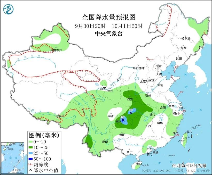 中央气象台预计,9月30日20时至10月1日20时,陕西中南部、黄淮西部、西南地区东部、云南西南部、江汉大部、湖南西部等地的部分地区有中到大雨,其中,重庆东北部和中西部等地的部分地区有暴雨(50~70毫米)。