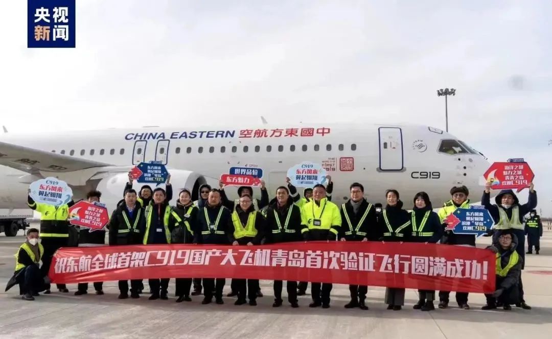 国产大飞机C919飞抵山东青岛执行验证飞行,标志着C919飞机100小时验证飞行再添新航点。