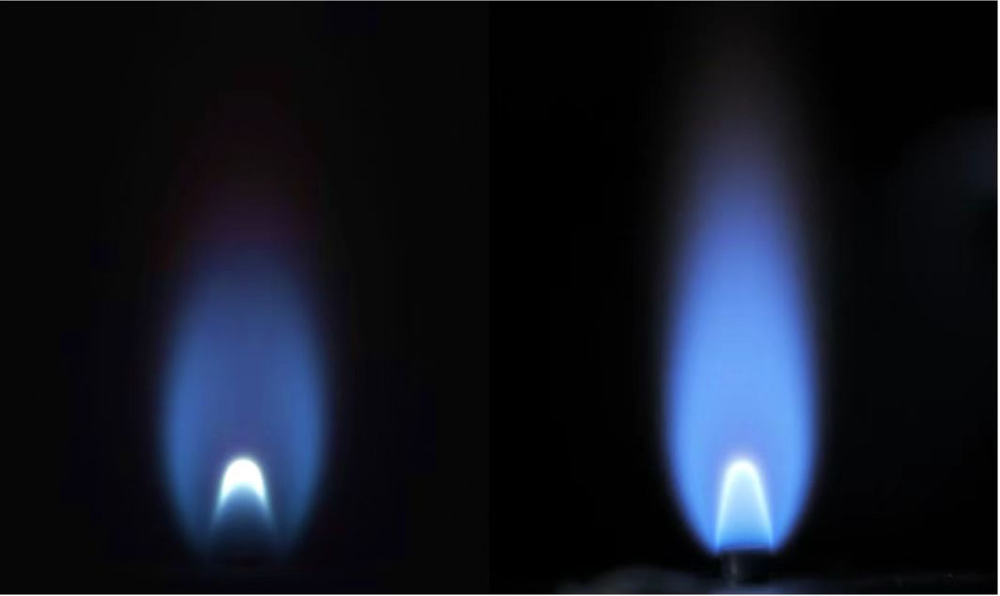 空间站燃烧科学实验柜甲烷燃烧图像(左)与地面同种工况甲烷燃烧图像(右)。(中国科学院工程热物理研究所、清华大学燃烧能源中心供图)