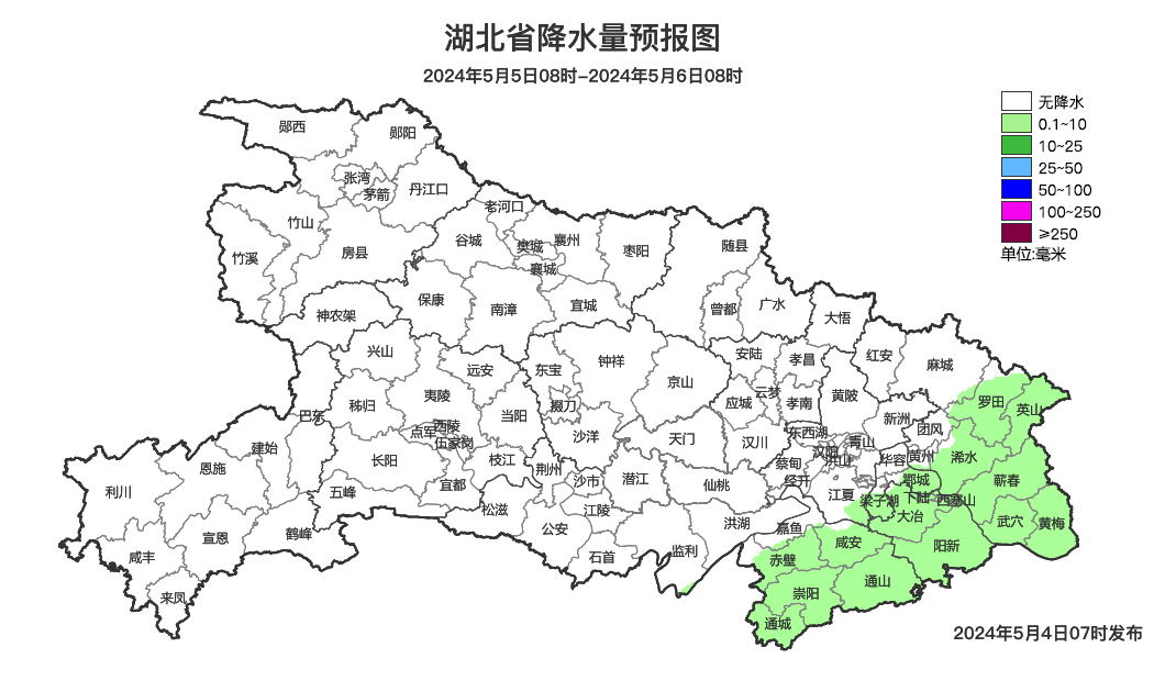 4日08时-5日08时,江汉平原东部、鄂东南、鄂东北东部阴天有中雨,局地大雨并伴有雷电、短时强降水等强对流天气;鄂西北阴天到多云,局部有零星小雨;其他地区小雨转阴天。最高气温18~22℃,最低气温13~17℃,偏北风3到4级、阵风5到6级。