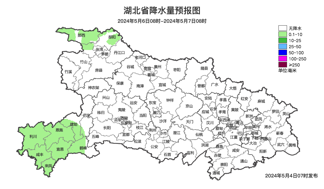6日08时-7日08时,全省多云到晴天,其中鄂西北、鄂西南局地有阵雨或雷阵雨。最高气温27~31℃,最低气温17~21℃,偏南风3到4级。