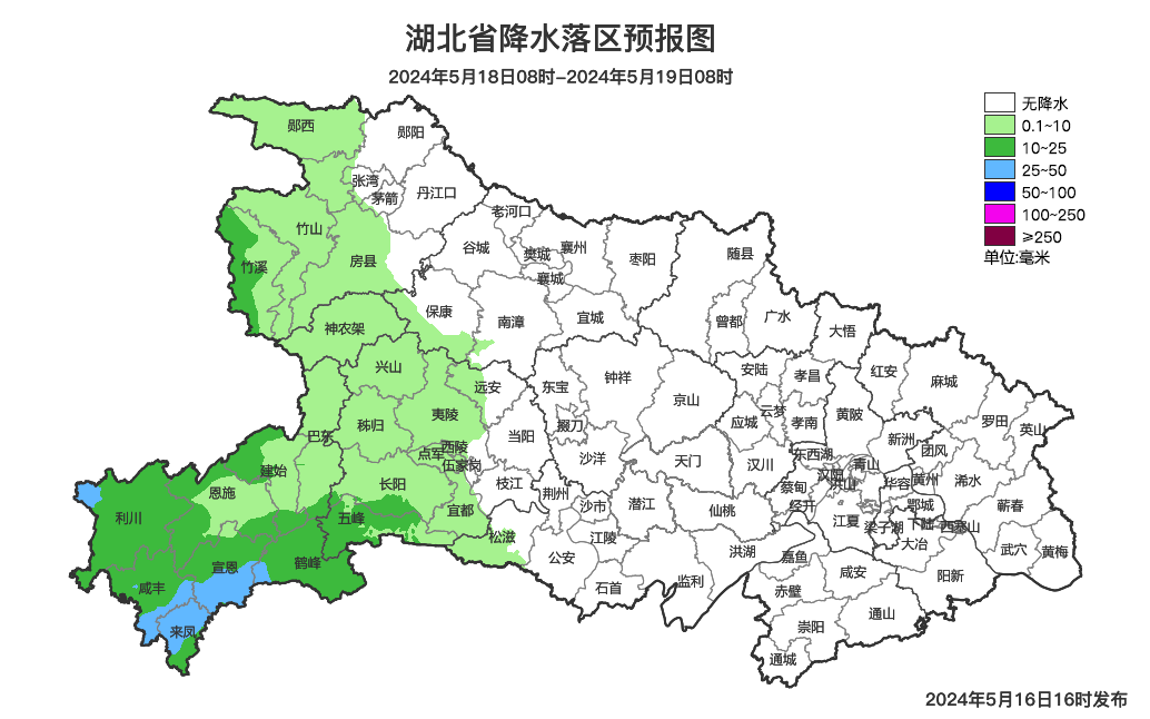 5月18日08时-19日08时,鄂西北西部、鄂西南多云转小到中雨,其中鄂西南局地大雨,并伴有雷电;其他地区晴天到多云。最高气温鄂西北34~35℃、其他地区30~34℃,最低气温21~25℃,偏南风3到4级、阵风5到6级。