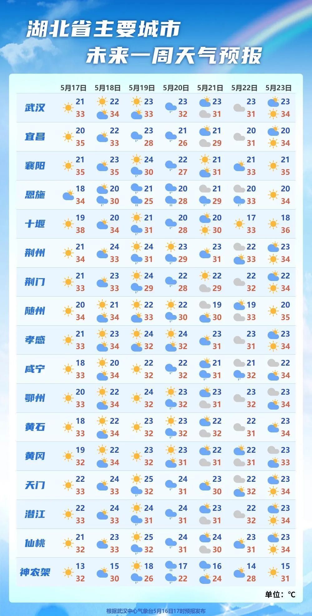 5月17日08时-18日08时,全省晴天到多云,其中鄂西南、鄂东北局地有阵雨或雷阵雨。最高气温鄂西北33~36℃,其他地区29~33℃,最低气温19~23℃,偏南风3到4级。