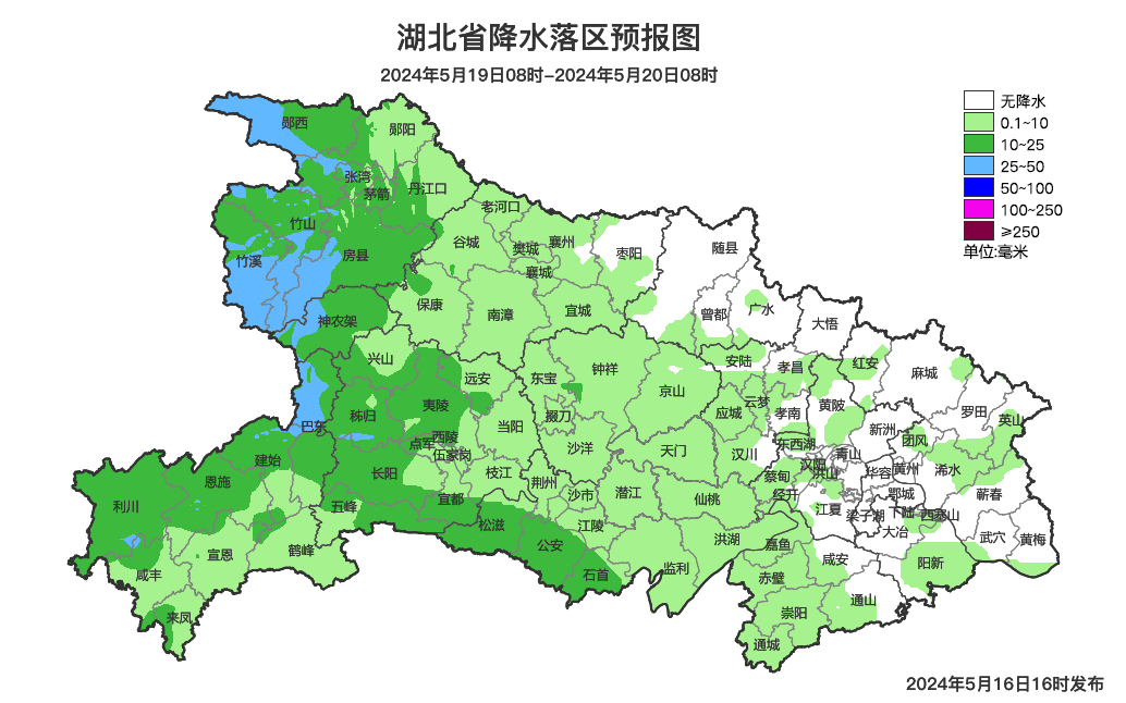 5月19日08时-20日08时,鄂西北、鄂西南阴天有小到中雨,局地大雨,并伴有雷电;其他地区多云,有分散性阵雨或雷阵雨。最高气温西部25~29℃、中东部29~33℃,最低气温20~24℃,偏东风3到4级。