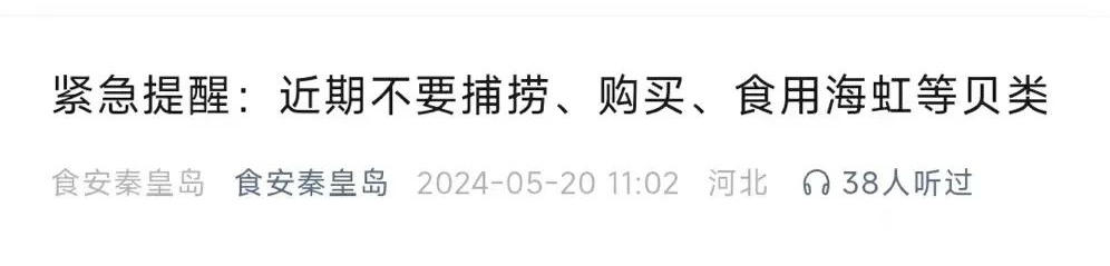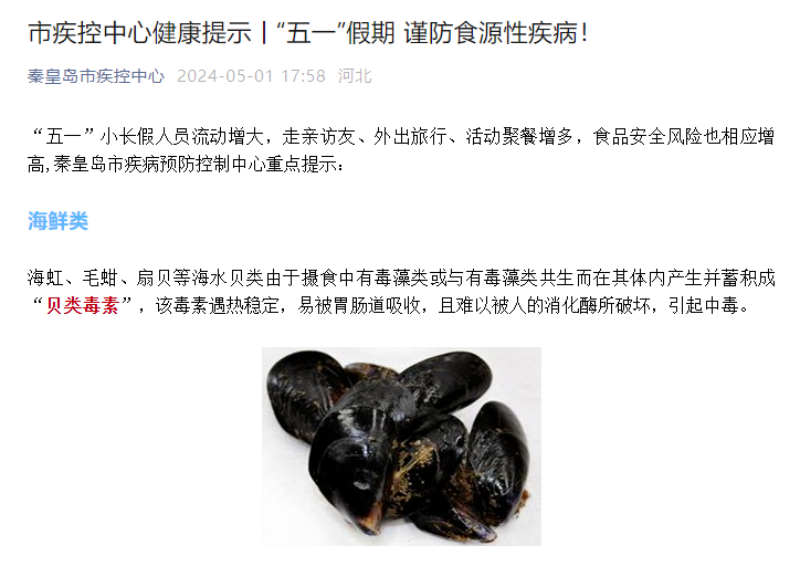 近日秦皇岛市市场监督管理局通过“食安秦皇岛”微信公众号发布紧急提醒近期海虹中麻痹性贝类毒素超标风险高发建议广大群众不要捕捞、购买、食用海虹严重的会导致呼吸停止