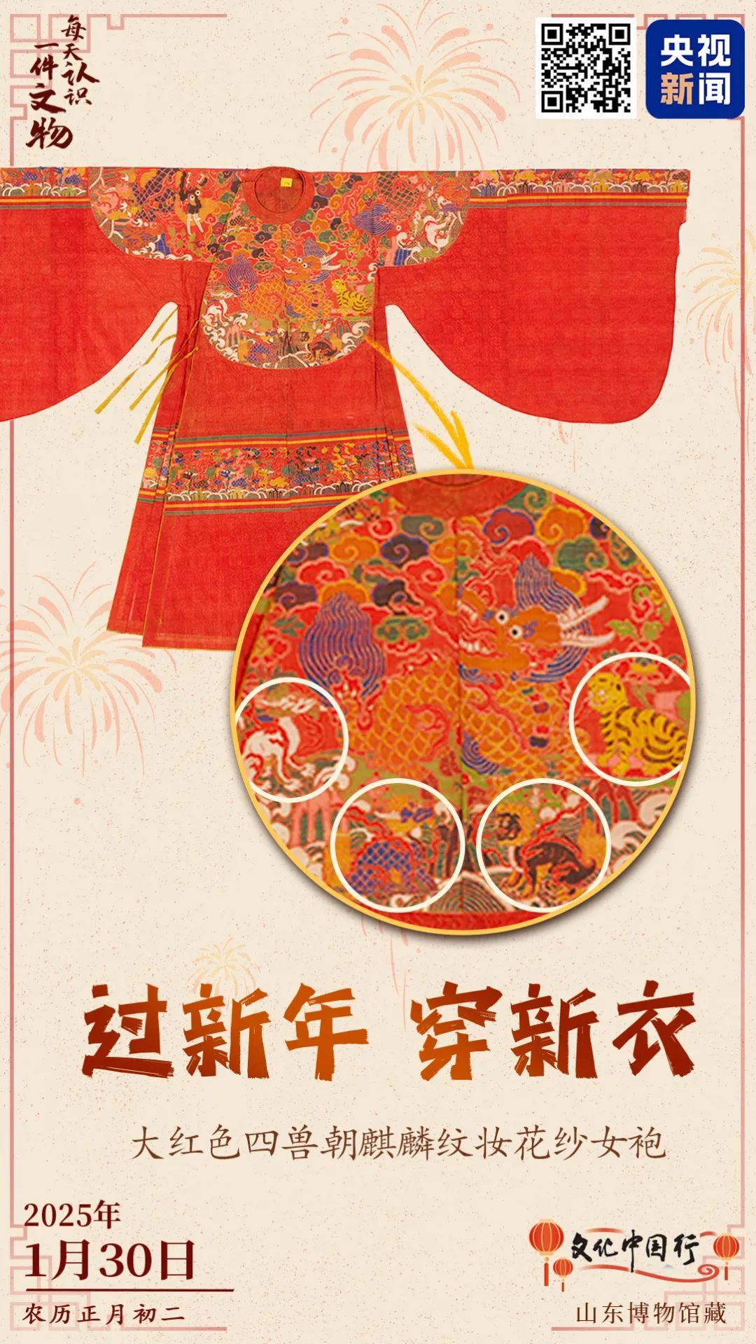 过年穿什么新衣?这件大红色四兽朝麒麟纹妆花纱女袍是明代女吉服的典型,整件衣服使用颜色多达十多种,浓艳炫丽又明朗,穿上新年氛围感瞬间拉满。