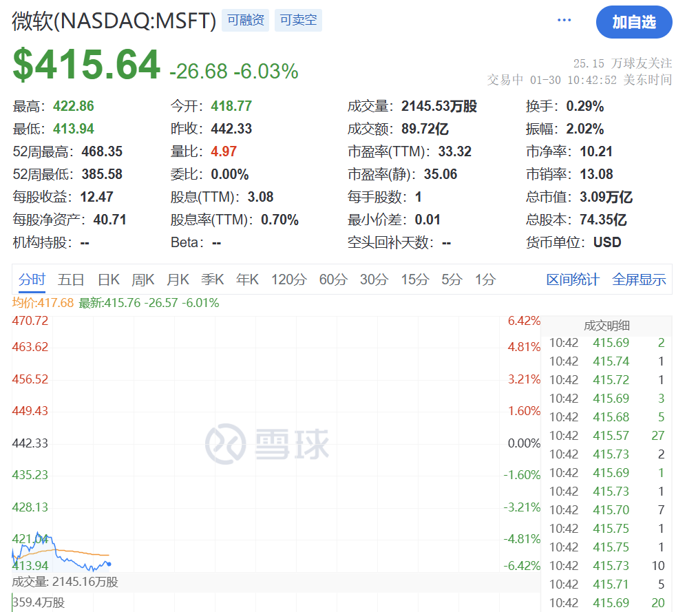 微软股价大跌6%,微软公司周三公布,其2025财年第二季度营收为696亿美元,较上年同期增长12%,超过分析师预期。不过,这家科技巨头的智能云营收尽管增长19%至255亿美元,但仍不及预期,而Azure营收增幅则降至31%,而上一季度为33%。此外,该公司还给出了令人失望的季度营收预测。