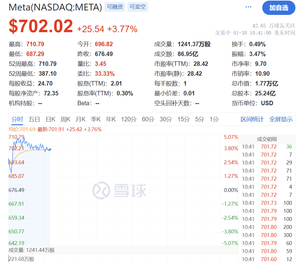 大型科技股涨跌不一,万得美国科技七巨头指数跌0.64%。个股方面,特斯拉涨超2%,谷歌母公司Alphabet涨逾2%,英伟达涨近1%,苹果跌0.74%,亚马逊跌逾1%,微软跌超6%,Meta股价一度涨超4%,盘中突破700美元关口,再创历史新高!公司去年四季度业绩超预期,今年资本支出指引大幅增加。扎克伯格称,最新Llama模型在取得“巨大进步”,相信市场有空间让多款AI App蓬勃发展,预计今年高度智能和个性化的AI助手将覆盖10亿人、Meta的助手业内领先。