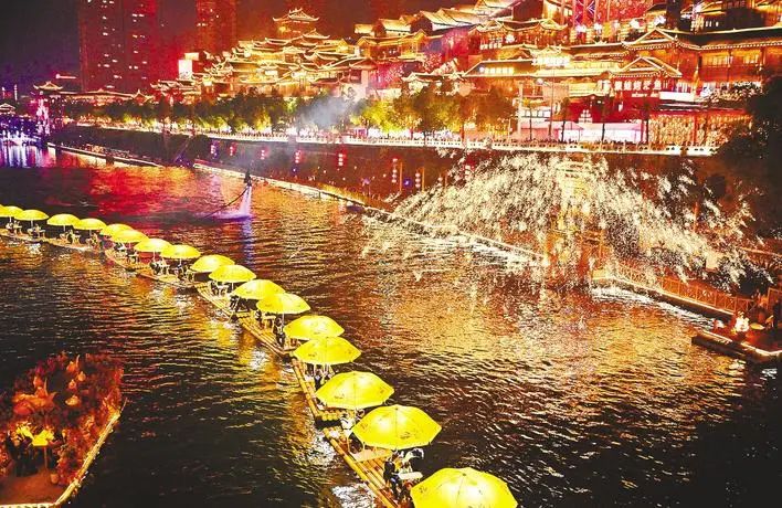 1月29日晚,在宣恩县城贡水河上,人们乘坐“龙游贡水”竹筏观看打铁花表演。(宋文 摄)