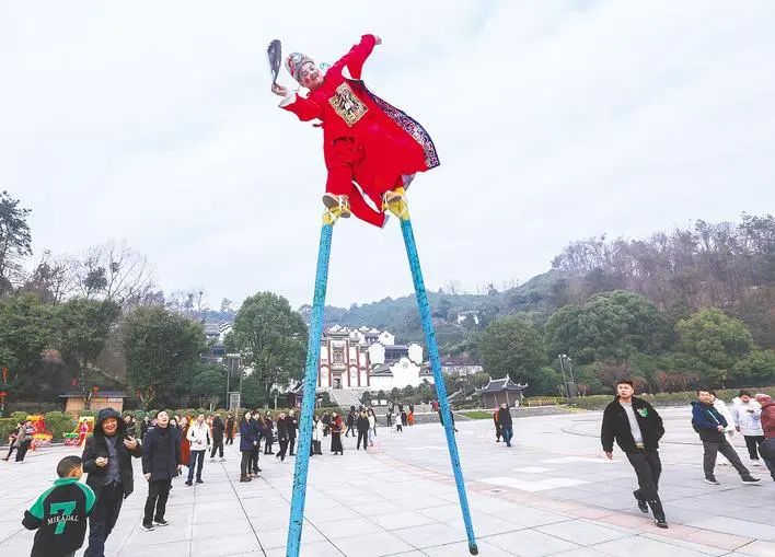 1月30日,秭归县屈原故里文化旅游区举行“非遗高跷闹新春”活动。(王罡 鲁苏 摄)
