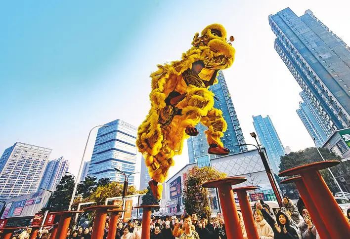 1月29日,在襄阳市樊城区长虹路,舞狮艺人在街头勇闯梅花桩,欢庆乙巳年的到来。(王虎 摄)