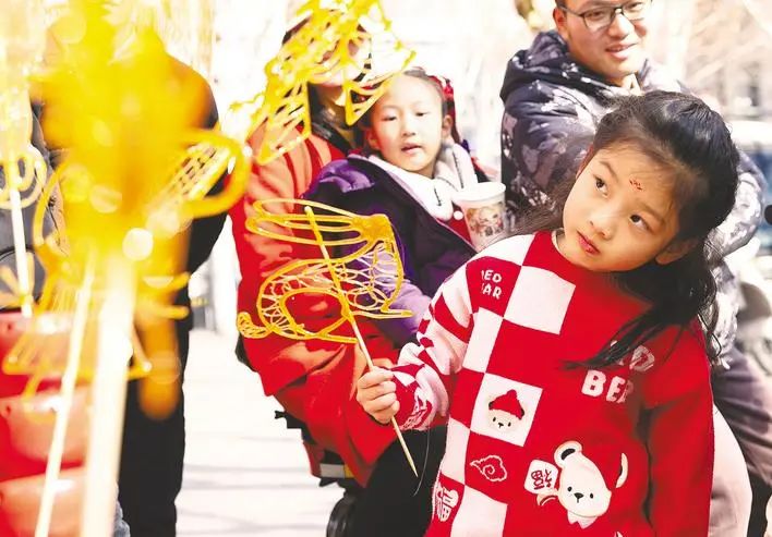 1月29日,武汉吉庆街非遗集市人来人往,小朋友被非遗糖画吸引。(薛婷 摄)