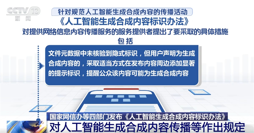 央视网消息:记者14日从国家网信办获悉,为了促进人工智能健康发展,规范人工智能生成合成内容标识,国家网信办、工业和信息化部、公安部、国家广播电视总局制定了《人工智能生成合成内容标识办法》。《标识办法》将于2025年9月1日起施行。