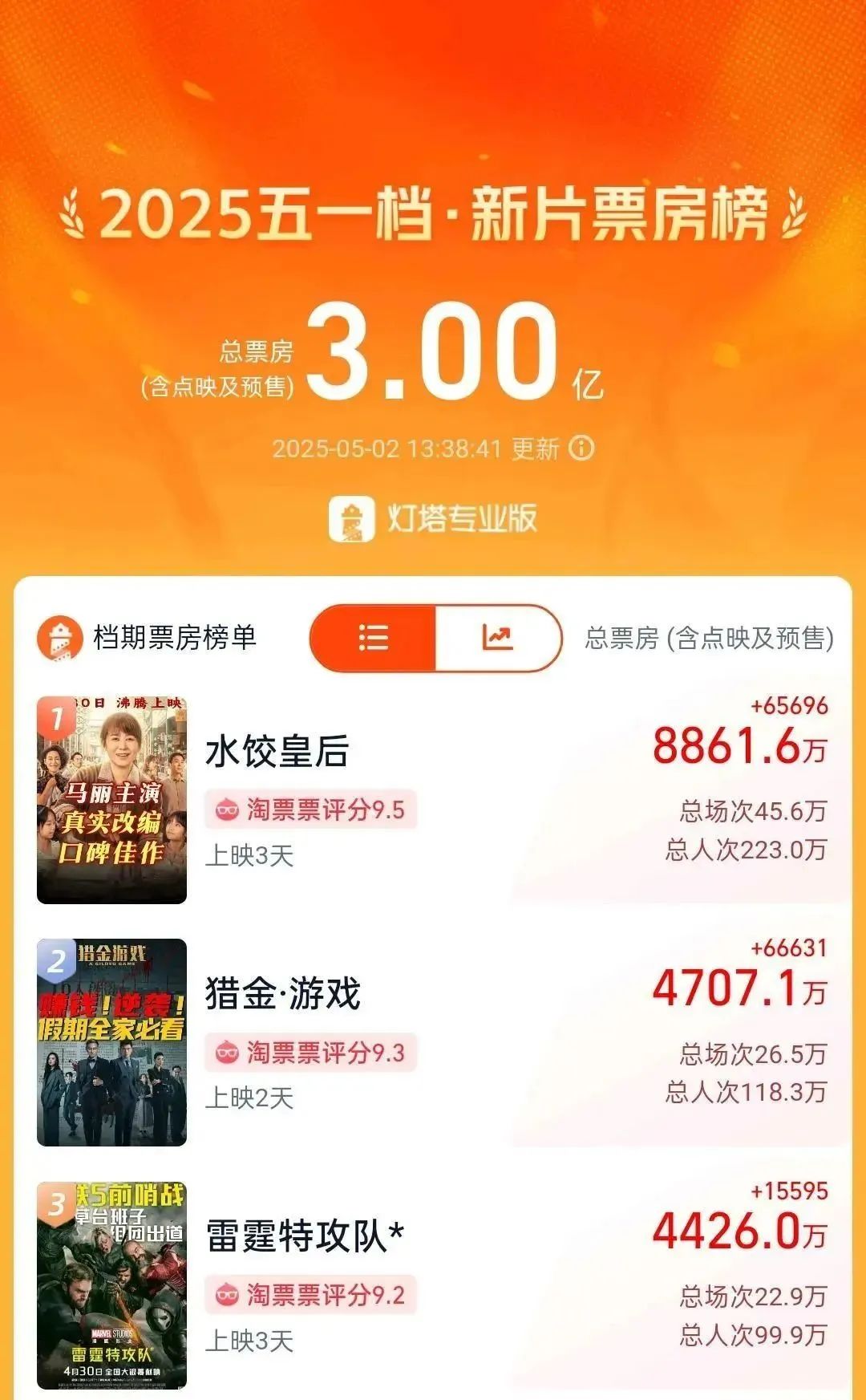 据网络平台数据,截至2日13时38分,今年五一档电影新片(含重映)总票房(含点映及预售)突破3亿元。
