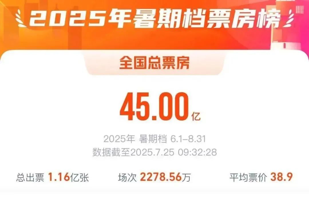 据网络平台,截至25日9时30分,暑期档(6月—8月)总票房(含预售)突破45亿。