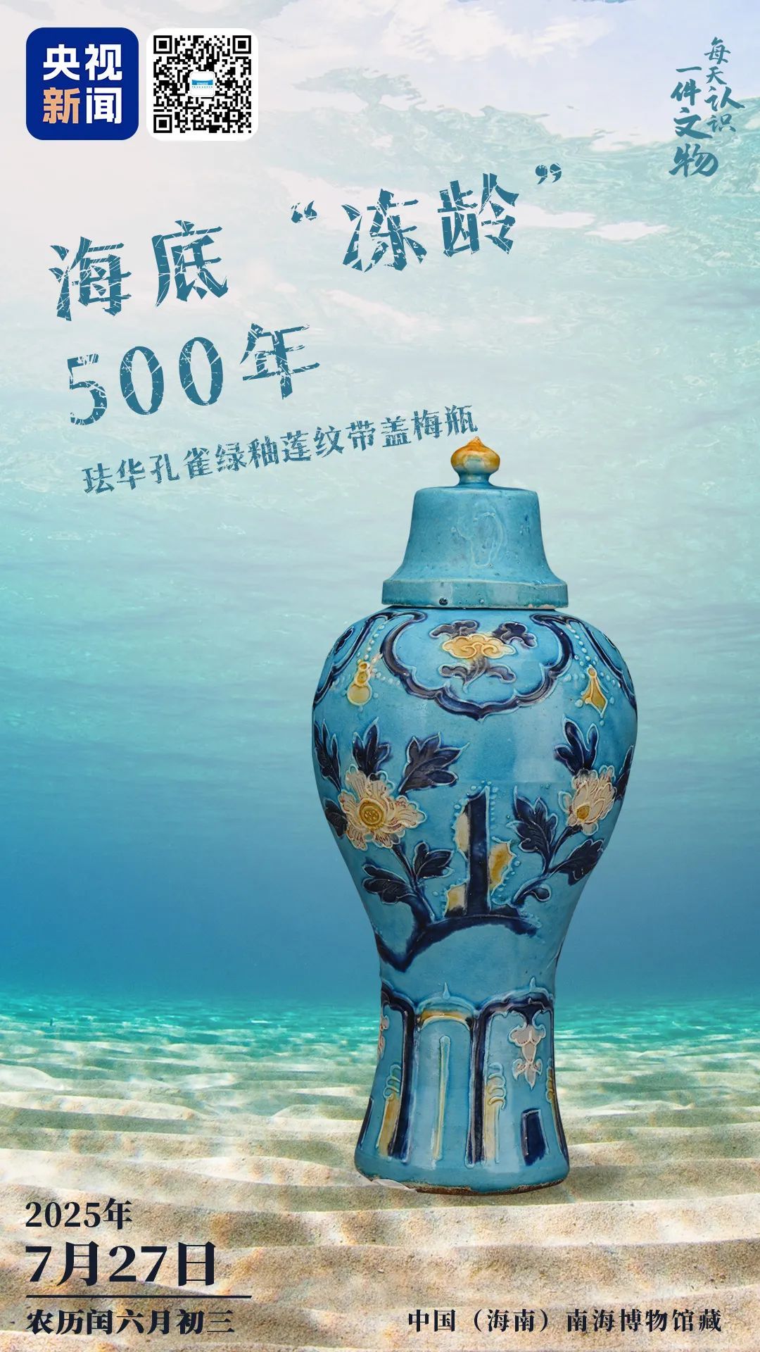 珐华孔雀绿釉莲纹带盖梅瓶,以浅蓝釉为底,自上而下有灵芝纹、云肩纹、莲纹、仰莲纹等,雅致又不拘一格;运用珐华装饰技法,类似“蛋糕裱花”,把纹饰“挤”到素胎上,呈现浮雕质感。它来自1500米深的海底,当年的商船已难觅身影,但它却在深海低温低氧环境中“冻龄”500年。