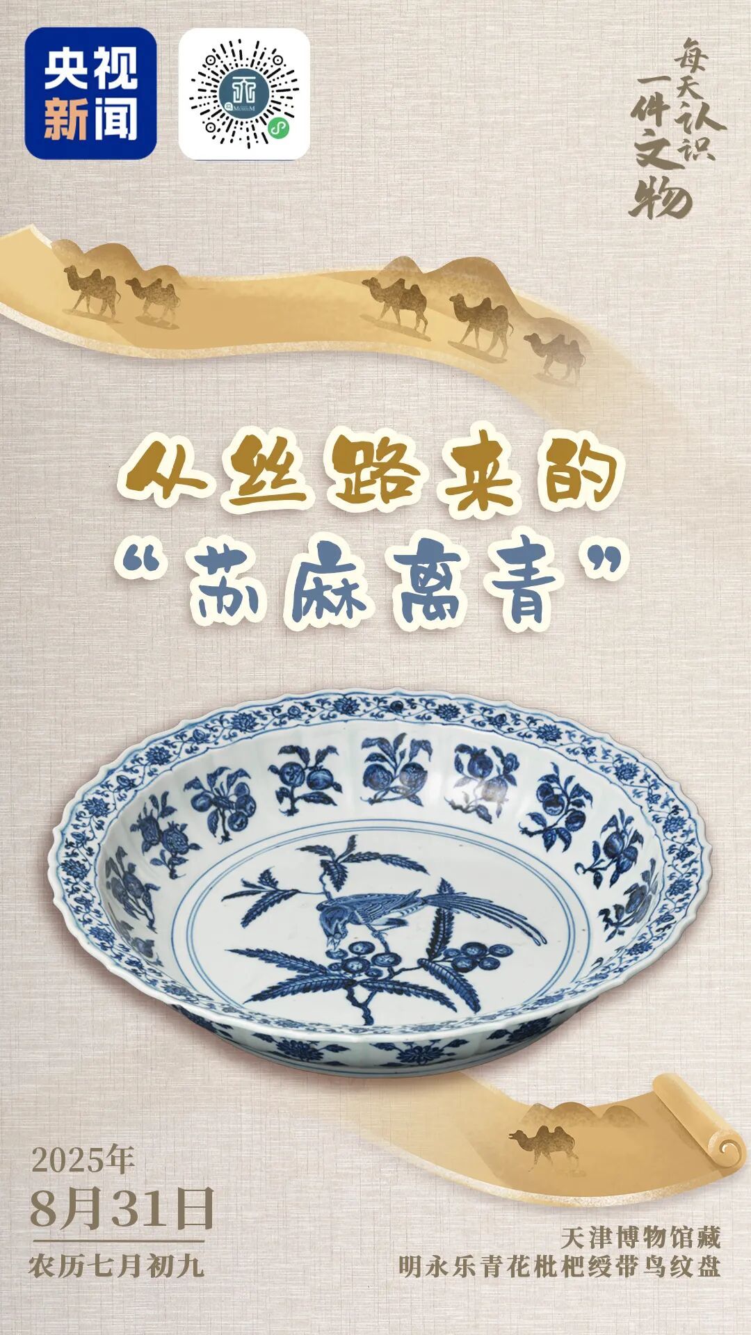2025年上海合作组织峰会今天正式拉开帷幕。“上合组织大家庭”齐聚天津,好朋友、新伙伴济济一堂。今天,带你认识一件青花瓷盘,感受600年前中国与西亚地区的文化交融。