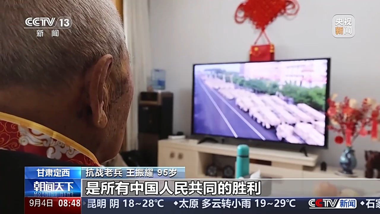 抗战老兵 王振耀:抗日战争的胜利是所有中国人共同的胜利,我们牺牲了多少同志,才赢得了民族的独立和伟大的胜利。这次阅兵看到了祖国的富强,人民军队的强大,武器的先进,军队精神得到了很好的传承。
