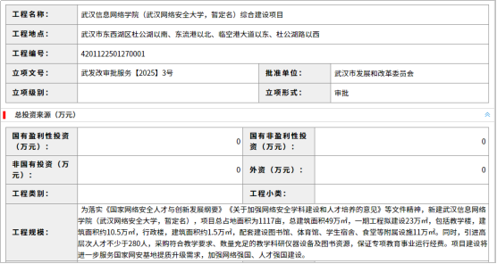 2025年2月,武汉公共资源交易平台发布武汉信息网络学院(武汉网络安全大学,暂定名)综合建设项目招标公告登记。