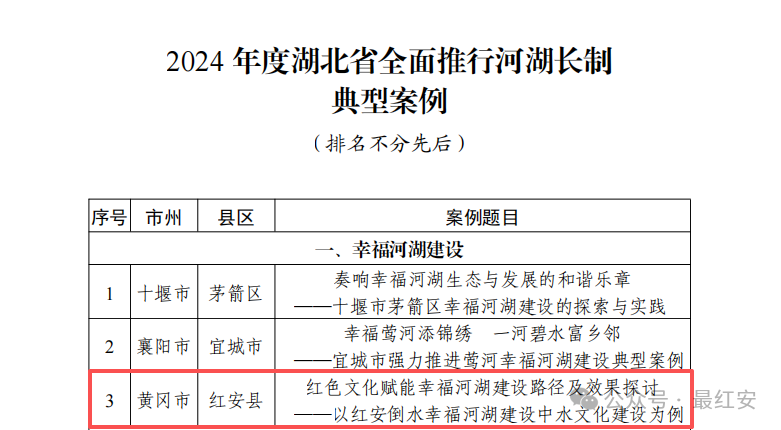 9月19日,湖北省河湖长制办公室公布了2024年度湖北省全面推行河湖长制典型案例,红安县《红色文化赋能幸福河湖建设路径及效果探讨》成功入选,成为黄冈市唯一获此殊荣的县市,其将红色基因与水生态文明深度融合的创新路径获全省推广。