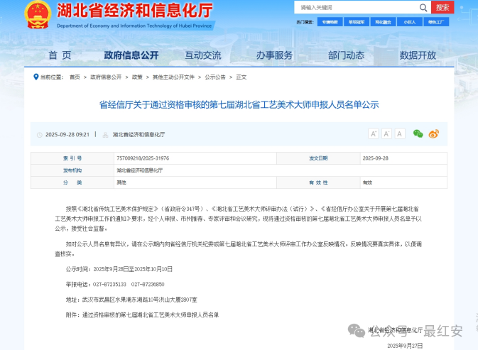 近日,湖北省经济和信息化厅公示了第七届湖北省工艺美术大师通过资格审核申报人员名单,福锦织绣文化传播有限公司总经理陶文成,凭借其精湛的织绣技艺,成功通过“湖北省工艺美术大师”资格审核,这是红安县历史上第1位“湖北省工艺美术大师”。