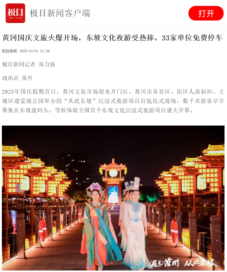 《黄冈国庆文旅火爆开场,东坡文化夜游受热捧,33家单位免费停车》