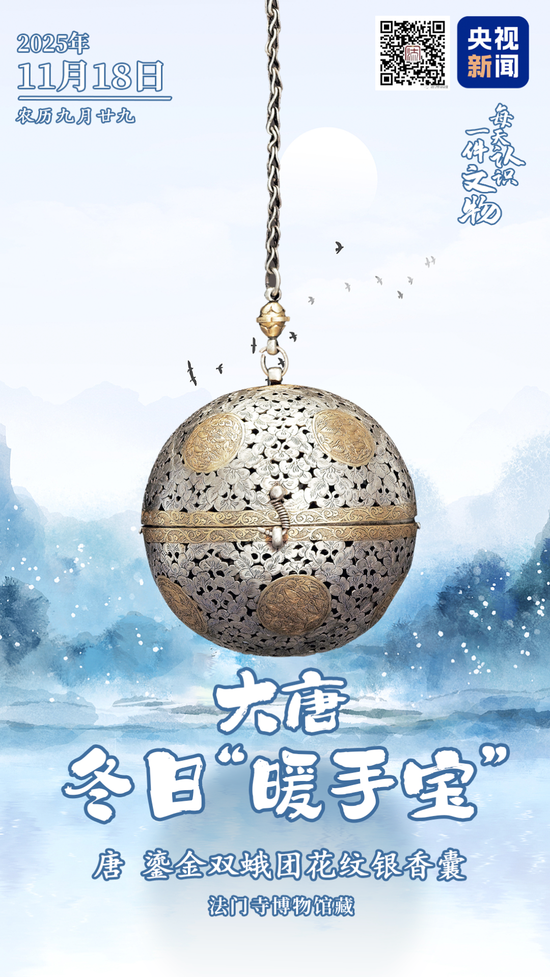 古人是如何御寒过冬的?一起看看大唐冬日“暖手宝”——鎏金双蛾团花纹银香囊。将它打开后,把点燃的香料放置在半圆小碗中,合上香囊,香气就从镂空处袅袅散出,不仅能熏香,还可以取暖。这件香囊是迄今国内发现的唐代香囊存世品中最大的一枚,由唐懿宗供奉于法门寺地宫。