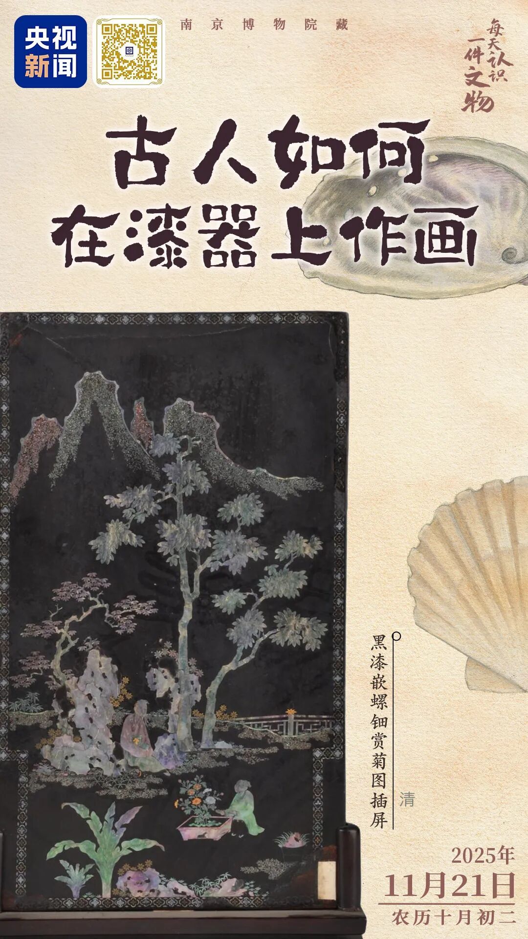 黑漆嵌螺钿赏菊图插屏,收藏于南京博物院,描绘的是陶渊明赏菊这一经典题材。这件插屏最令人惊叹的,莫过于其精湛的螺钿工艺,这是一门将贝壳“变成画”的手艺。工匠将夜光贝、蚌壳裁剪、打磨成薄片,在漆面上拼嵌出各式图案,当光线掠过,贝片便会折射出如彩虹般的光晕,五彩斑斓,精妙绝伦。