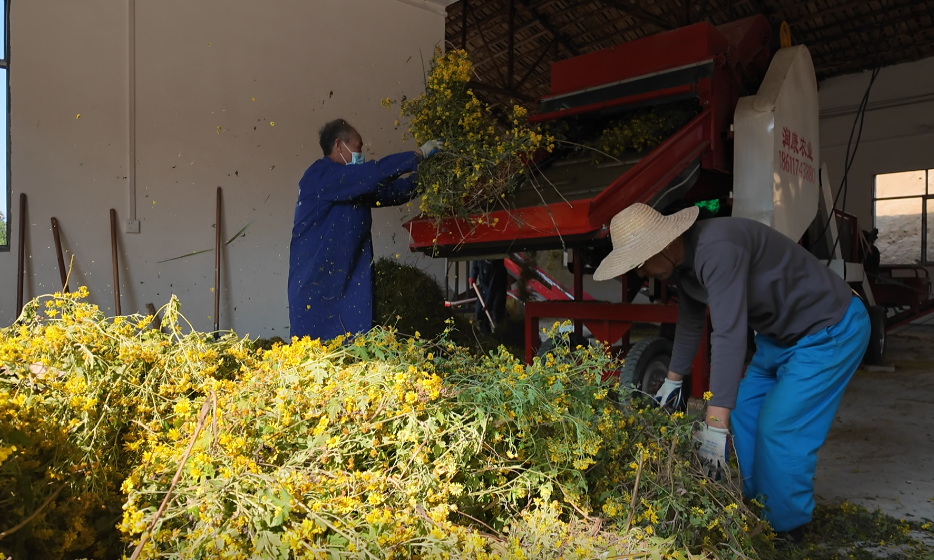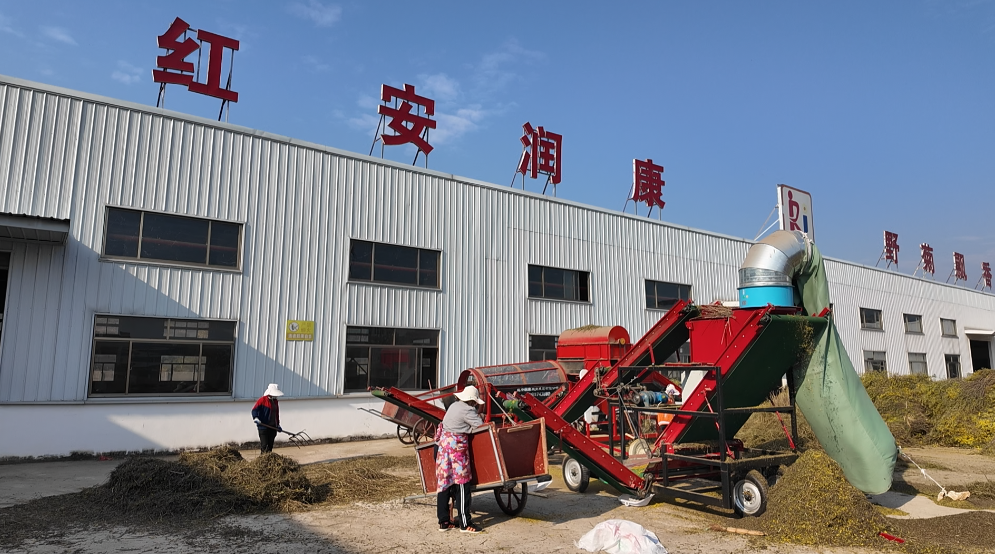 红安润康农业发展有限公司董事长董正道:“我公司建了1万平方米的加工厂房,并购置了10多套野菊花的脱花设备,还有2套野菊花全自动烘干线,1000多平方米的冷藏库,并在全县设置了10多个加工点,方便种植户就近交货。现在,我公司每天的加工量能达到80多吨,预计今年的野菊花的总产量将达到4000多吨。”