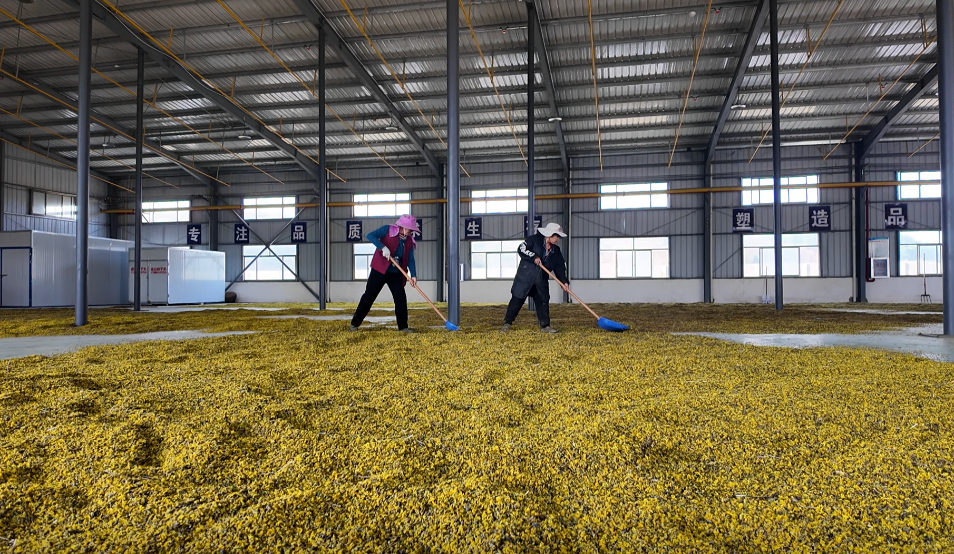 从田间鲜菊到药用干货,标准化加工是提升价值的关键。在自动化加工线上,朵朵鲜菊经过脱花、筛选、杀青、烘干,蜕变为优质药材。