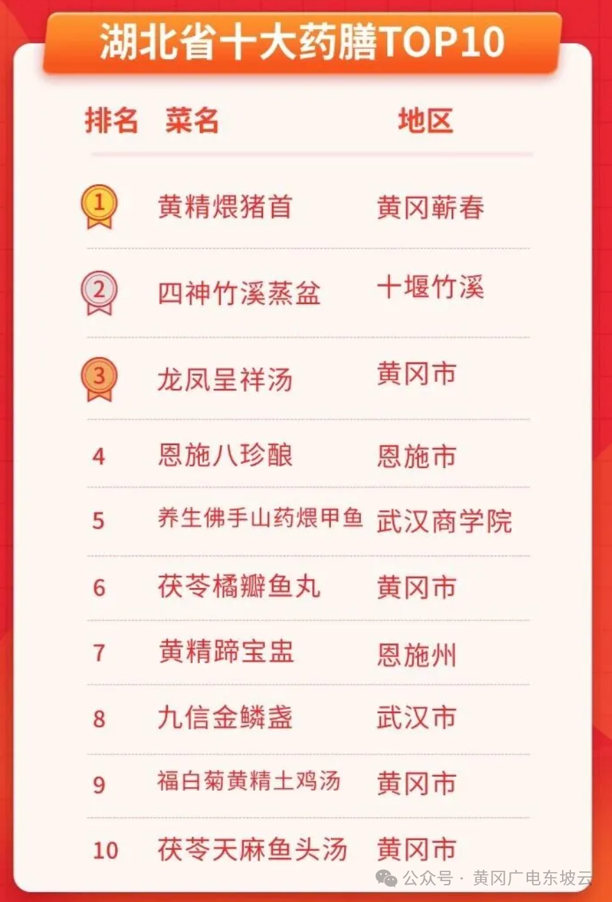 湖北省2025年十大药膳出炉,黄冈有五:黄精煨猪首、龙凤呈祥汤、茯苓橘瓣鱼丸、福白菊黄精土鸡汤、茯苓天麻鱼头汤。其中黄精煨猪首成功拔得头筹,跻身“湖北省十大药膳”榜首。