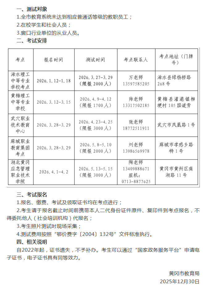 2026年黄冈市上半年普通话水平测试公告