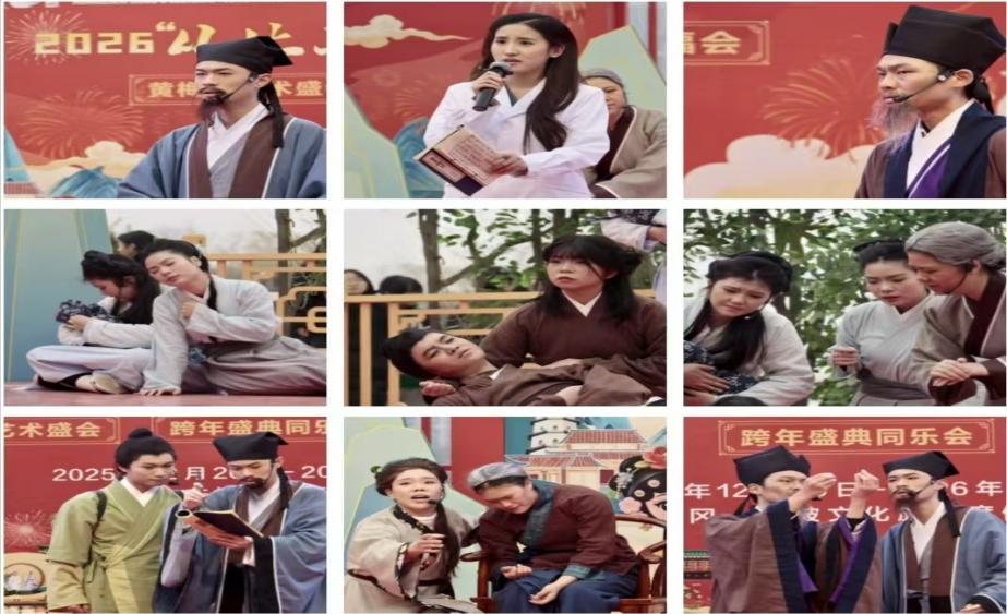 2026年1月3日,冬日的黄冈东坡文化旅游度假区内暖意融融,“从此东坡·遇见宋朝”禧乐嘉年华的舞台被喜庆的红绸与古雅的宋式布景装点得格外亮眼,一场融合本土文化与艺术创新的特殊演绎在此倾情上演。由黄冈师范学院传媒与影视学院丁敏玲老师担任编剧兼导演、传媒学院学子主演的话剧《本草长歌》惊艳亮相,为现场观众奉上了一场兼具文化厚度、艺术美感与精神共鸣的视听盛宴。