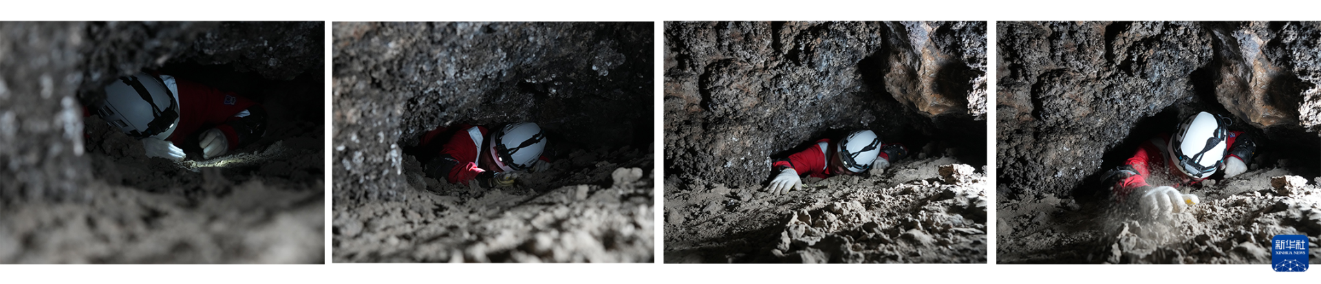 2025年12月,航天员开展洞穴训练艰难爬过狭窄管洞(拼版照片)。新华社发