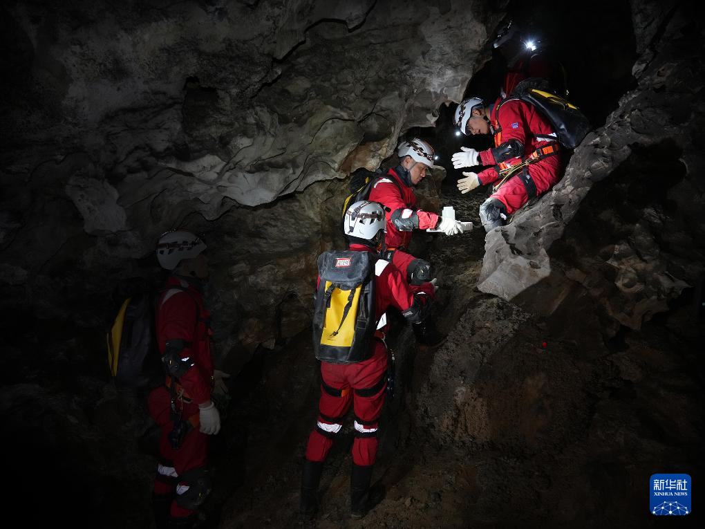 2025年12月,航天员在洞穴中进行物品传递协作训练。新华社发