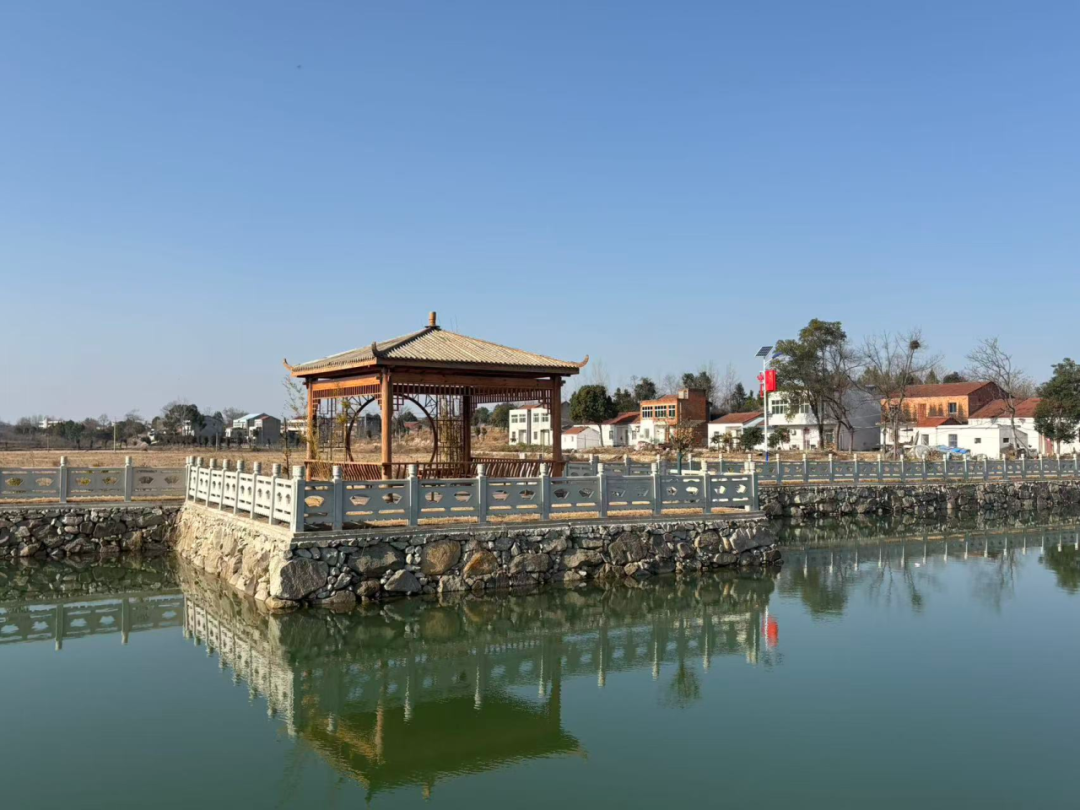 水塘边的石亭倒映在碧波里