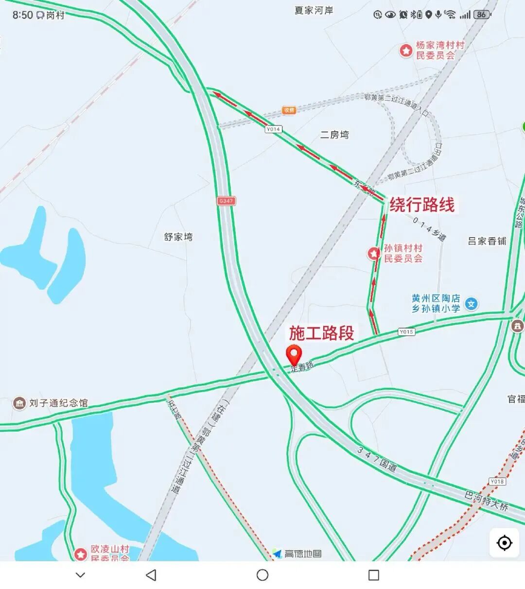 孙镇村前往G347方向车辆,需绕行东乡路(Y014)(施工路段周边将设置醒目标志指引);