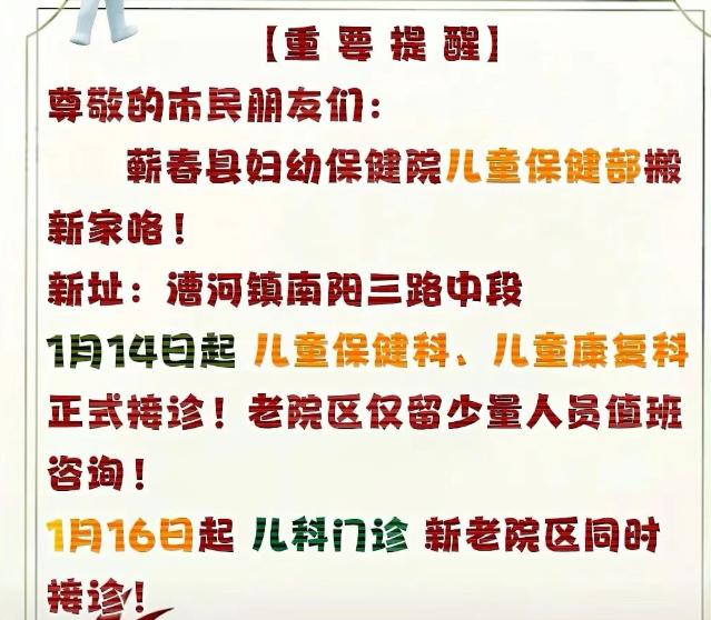 蕲春县妇幼保健院发布搬迁通知