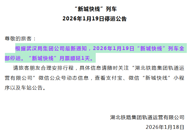 根据武汉局集团公司最新通知,2026年1月19日“新城快线”列车全部停运。“新城快线”月票顺延1天。