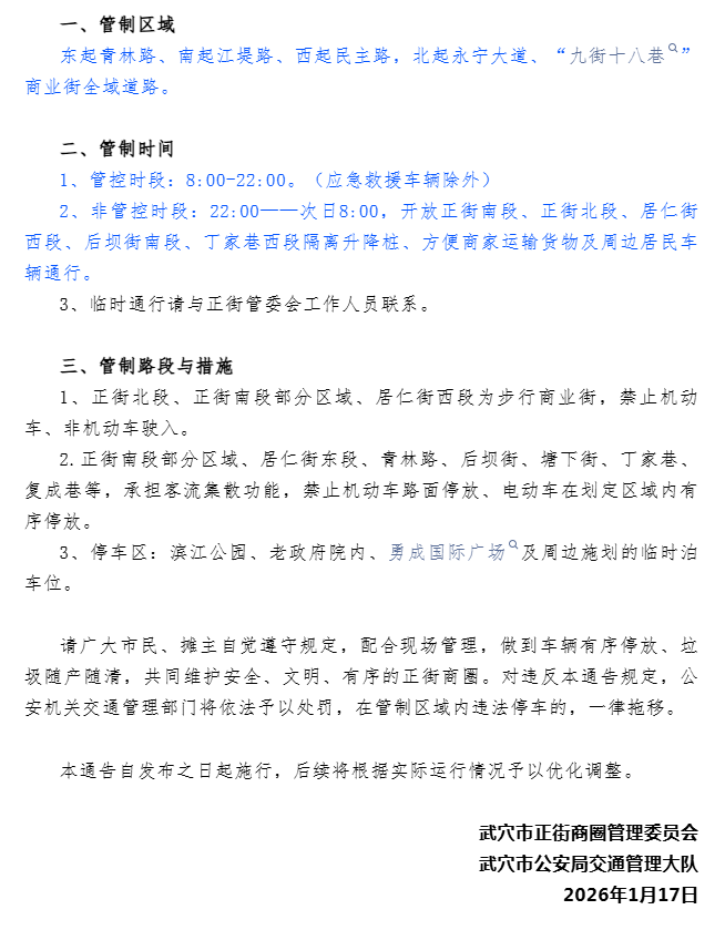 为提升正街商业活力,优化购物环境,保障交通安全,根据《中华人民共和国道路交通安全法》等相关规定,决定对武穴正街商业区实行分时交通管制措施。