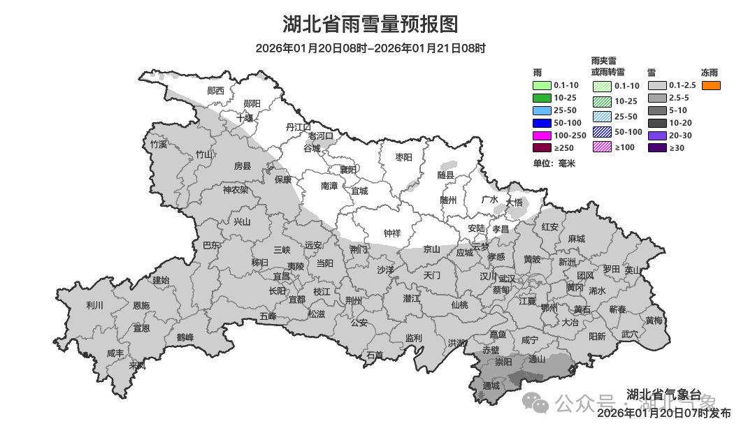 据湖北气象最新消息,1月19日7时至1月20日7时,全省自北向南出现冻雨和雪,大部分地区中到大雪,其中十堰北部、襄阳、神农架、随州大到暴雪;大部分地区积雪深度1~5厘米,鄂西北和随州5~10厘米(谷城和枣阳15厘米,襄阳襄州区13厘米,保康、宜城和丹江口11厘米),大部分地区还出现短时冻雨或冰粒。