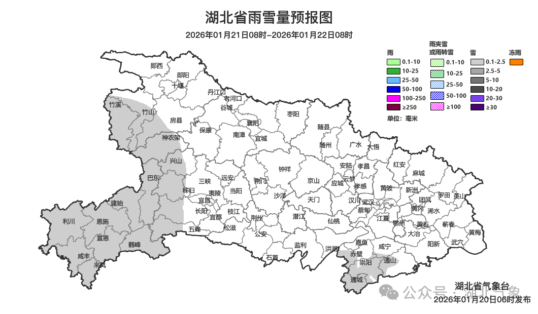 预计今天湖北省西部和南部降雪持续,有小到中雪局地大雪。明天(1月21日)全省大部降雪渐止,但低温冰冻将持续至1月22日,1月23日起气温略有回升,1月25日前后还会有一次降水过程,请大家密切关注。