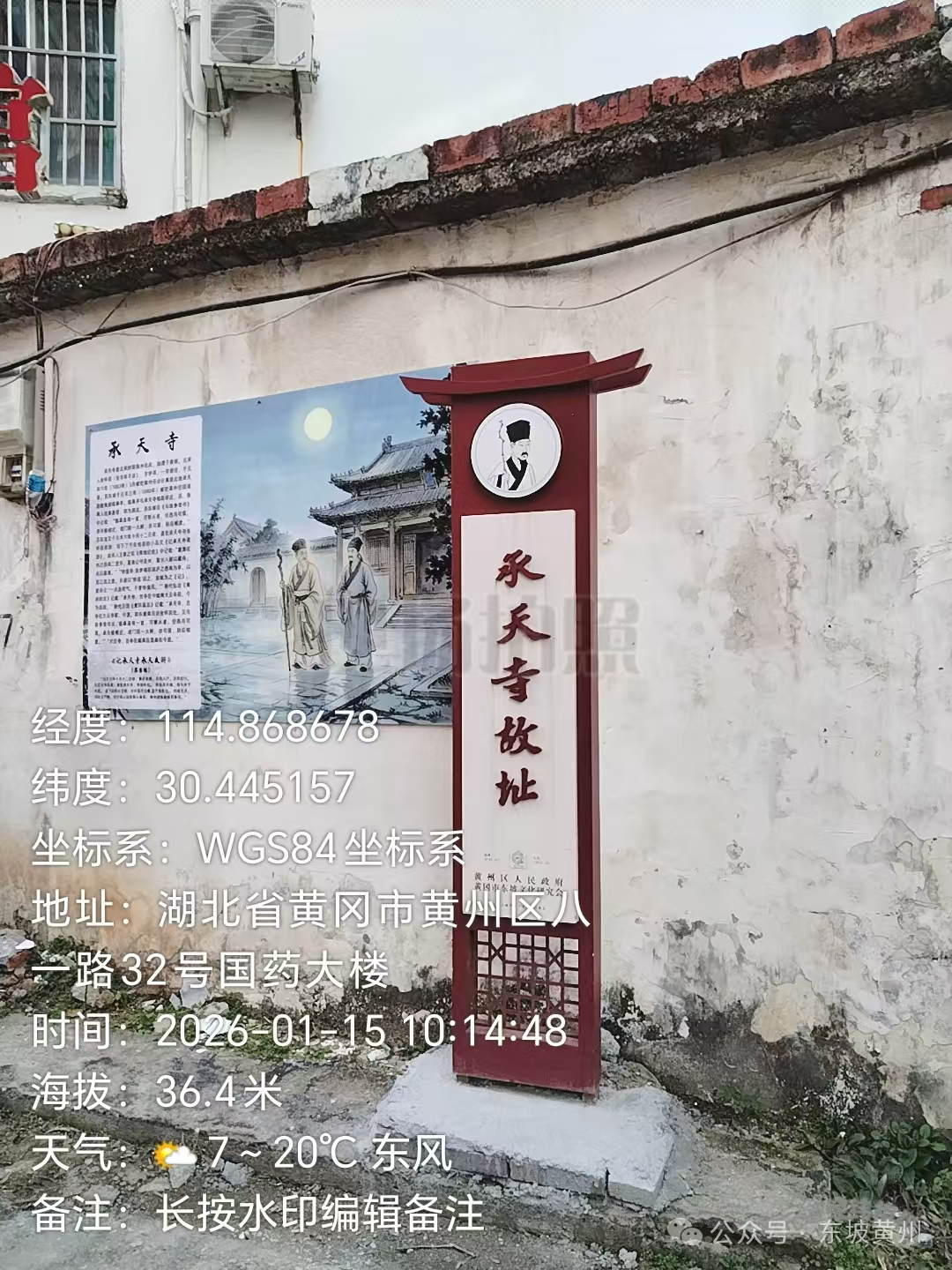 承天寺,北宋时期黄州名刹,始建于唐代。明弘治《黄州府志》记载,“承天寺,古寺,在今城南大云寺前,今为民居。”明万历《黄冈县志》记载,“大云寺,古寺,在城南五显庙右,今废。”