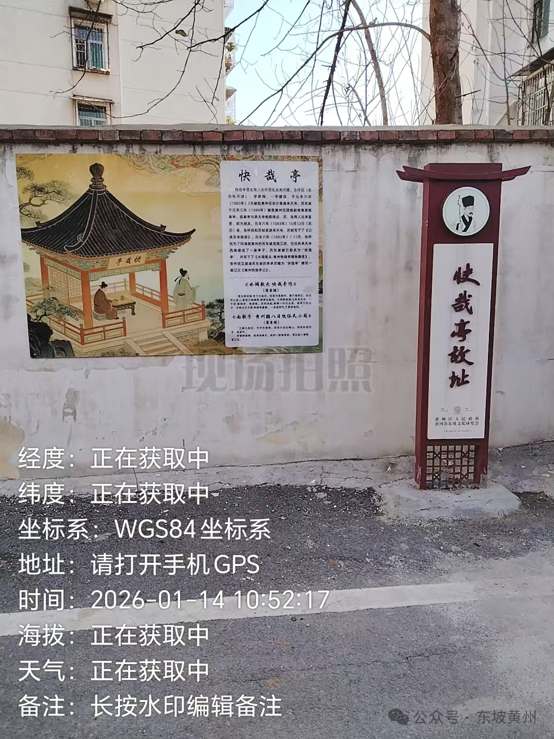 尽管黄州“城南”的承天寺、大云寺、五显庙早已不存,但在黄冈市东坡文化研究会和黄州区人民政府的共同努力下,按照指示牌的导引,我毫不费力地在黄冈市黄州区赤壁街道青云社区安国寺路与火王庙路的交汇处,找到了承天寺故址,地理坐标为:经度114.868678,纬度30.445157,海拔高程为36.4米。